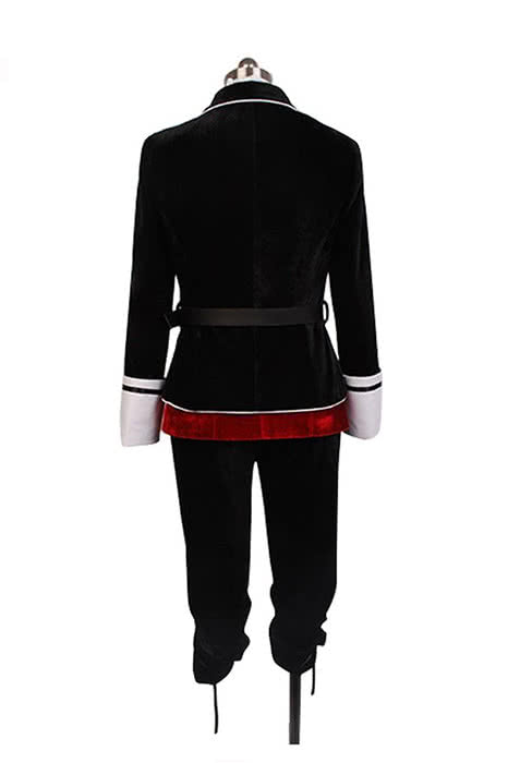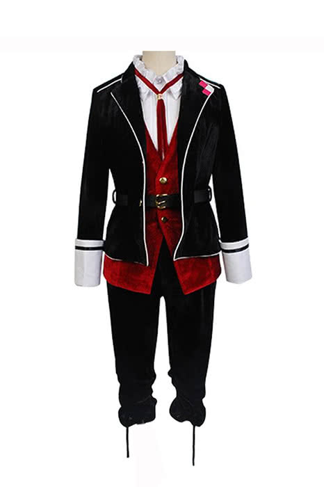 Character Introduction: Kanato Sakamaki's school uniform consists of the black school jacket over a maroon-colored vest with a red, string tie and a white undershirt with a ruffled Victorian collar, which are worn with black pants. He also wears short black knee-socks and brown dress shoes