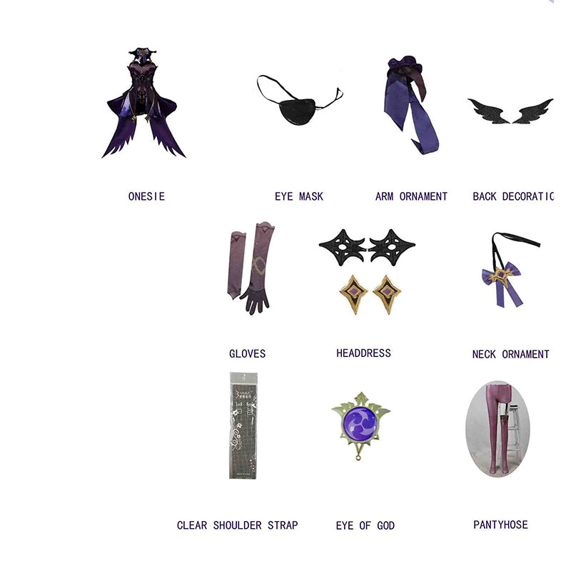 Included Items: Onesie, Eye mask, Arm ornament, Back decoration, Gloves, Headdress, Neck ornament, Clear shoulder strap, Eye of god, Pantyhose