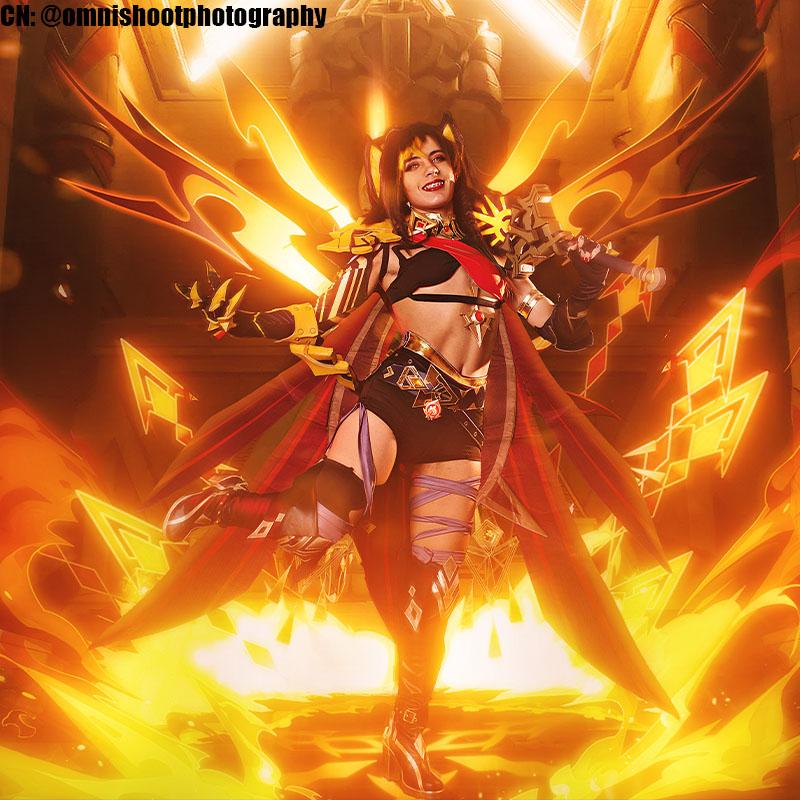 “Aqui é a @mf.cruvinel e eu adorei essa peruca da Dehya de Genshin! Já vem com as mechas loiras, fácil de estilizar e cheia de fios. Usei estrutura de EVA para criar o penteado e adicionei algumas mechas extras… o resultado ficou impressionante! Super recomendo!”