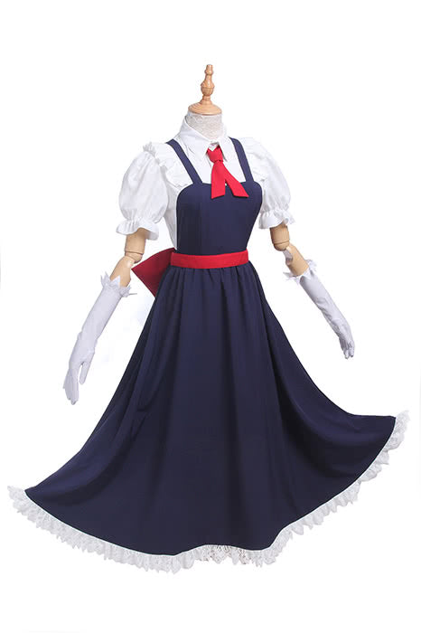 Features: This costume is based on the role Tohru in the new anime Miss Kobayashi's Dragon Maid. Same with the character, we use pure white/blue/red fabric to make this costume to show the role's lovely nature. Beside the same color, same garment style, we also have some details to make it more close to the character setting. By taking out darts, the white shirt can fit girls' bust better than common white shirt. In another words, it will make your bust look bigger in visual. Classic high waist A-line dress can fit to most kinds of bodyshape. It just show your slim waist .