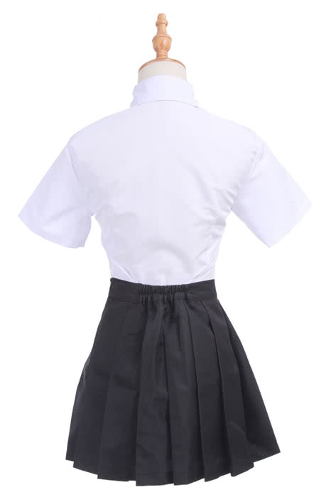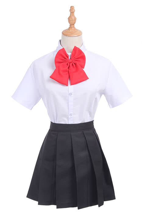 Features:This costume is based on the role Mitsuha Miyamizu in the movie Your Name. White short sleeves shirt, red bowknot, black pleated skirt. Everything is simple and pure.