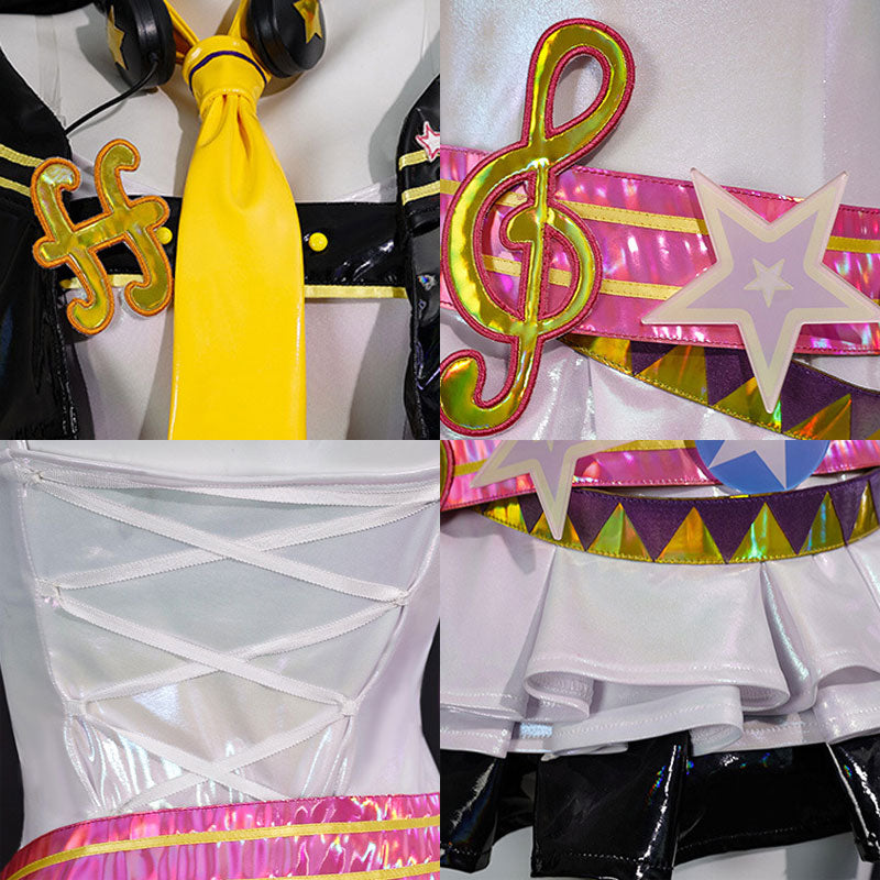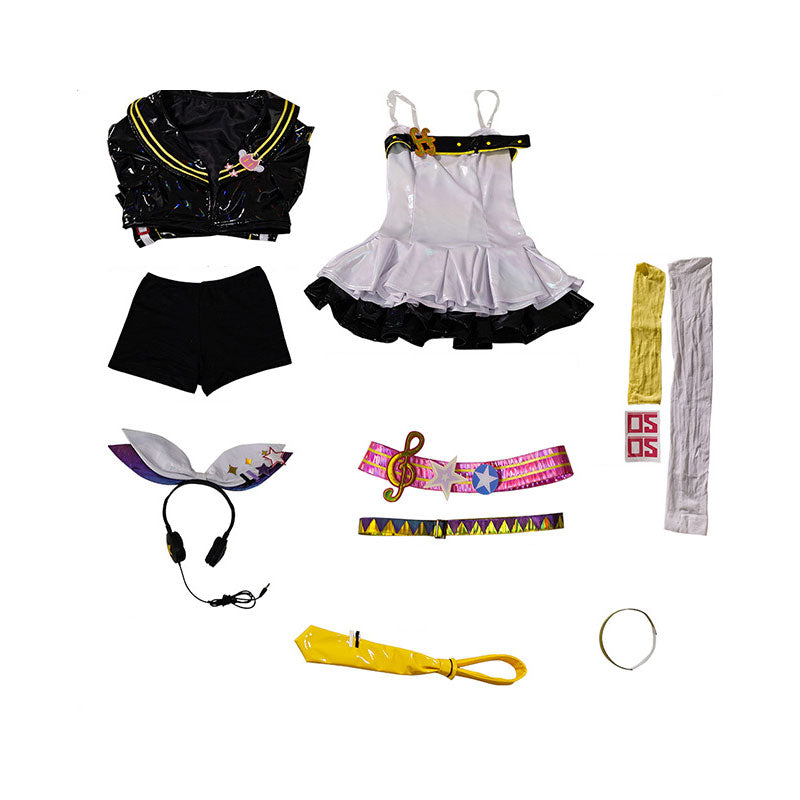 Included Items: Top*1, dress*1, leggings*1, tattoo sticker*1, socks*2, belt*2, tie*1, leg ring*1, earphone*1