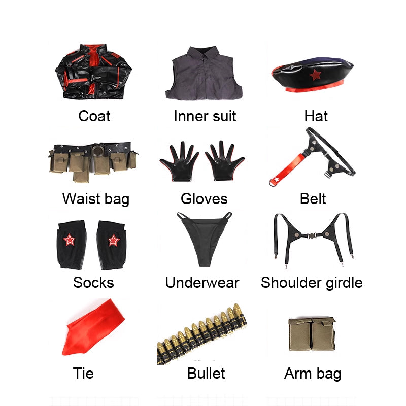 Included Items: Coat, Inner suit, Hat, Waist bag, Gloves, Belt, Socks, Underwear, Shoulder girdle, Tie, Bullet, Arm bag