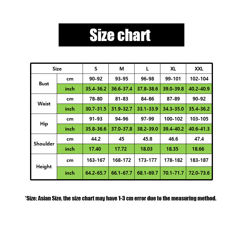 Size: Asian Size, the size chart may have 1-3 cm error due to the measuring method.