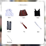 Set Includes: Shirt, Skirt, Vest, Glove, Tie, Belt, Necklace
