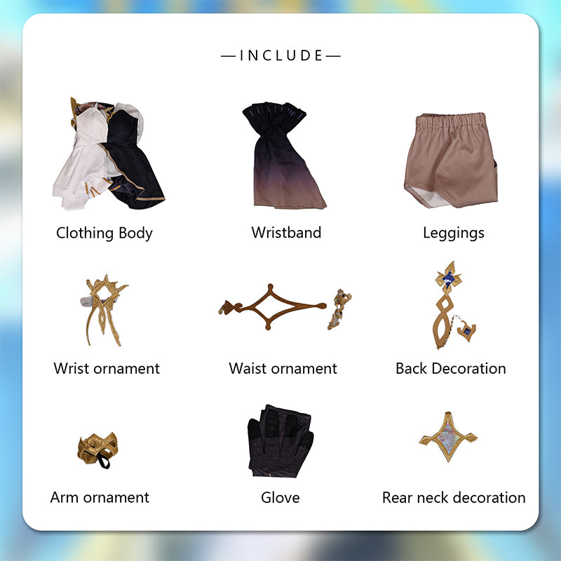 Set Includes: Clothing body, Wristband, Leggings, Wrist ornament, Waist ornament, Back decoration, Arm ornament, Glove, Rear neck decoration