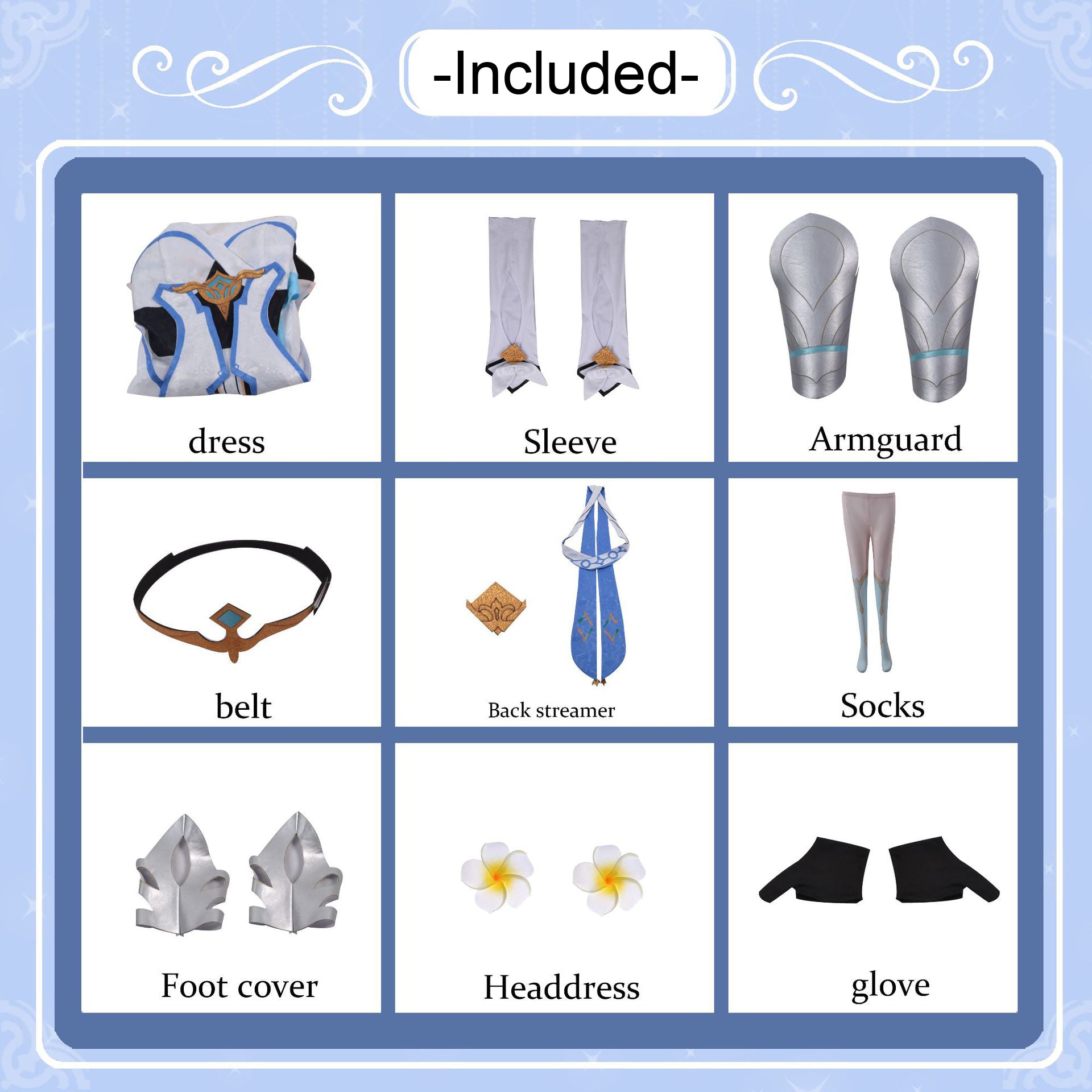 Set Includes: Dress, Sleeve, Armguard, Belt, Back streamer, Socks, Foot cover, Headdress, Glove