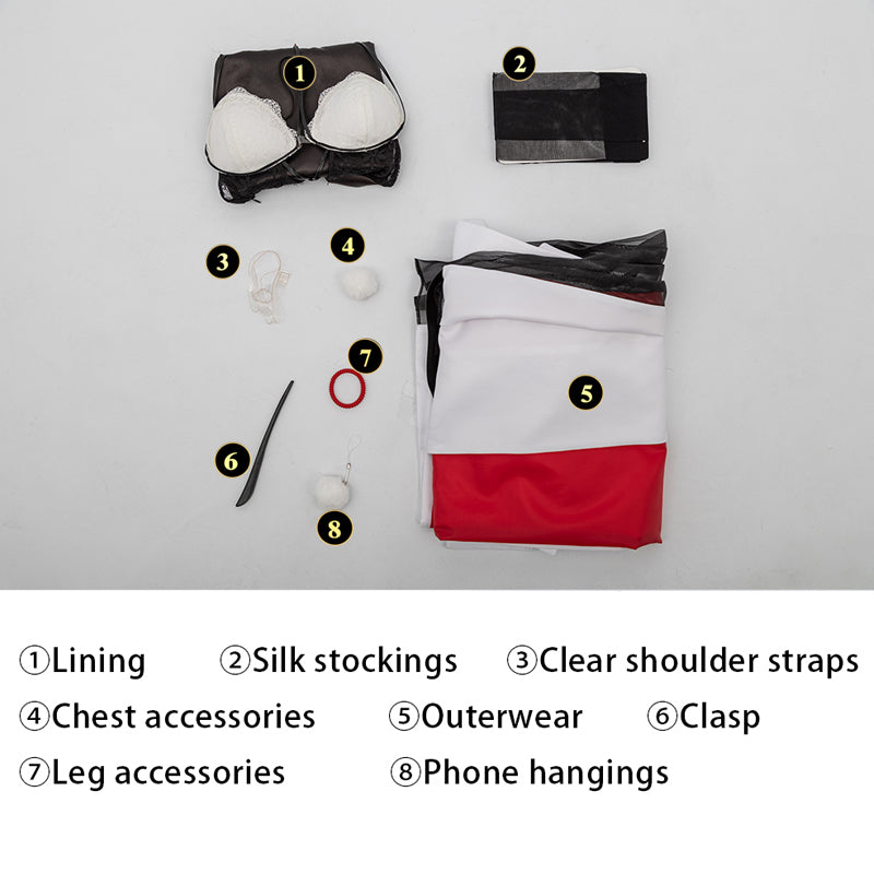 Set Includes: Lining, Silk stockings, Clear shoulder straps, Chest ornament, Outerwear, Clasp, Leg accessories, Phone hangings