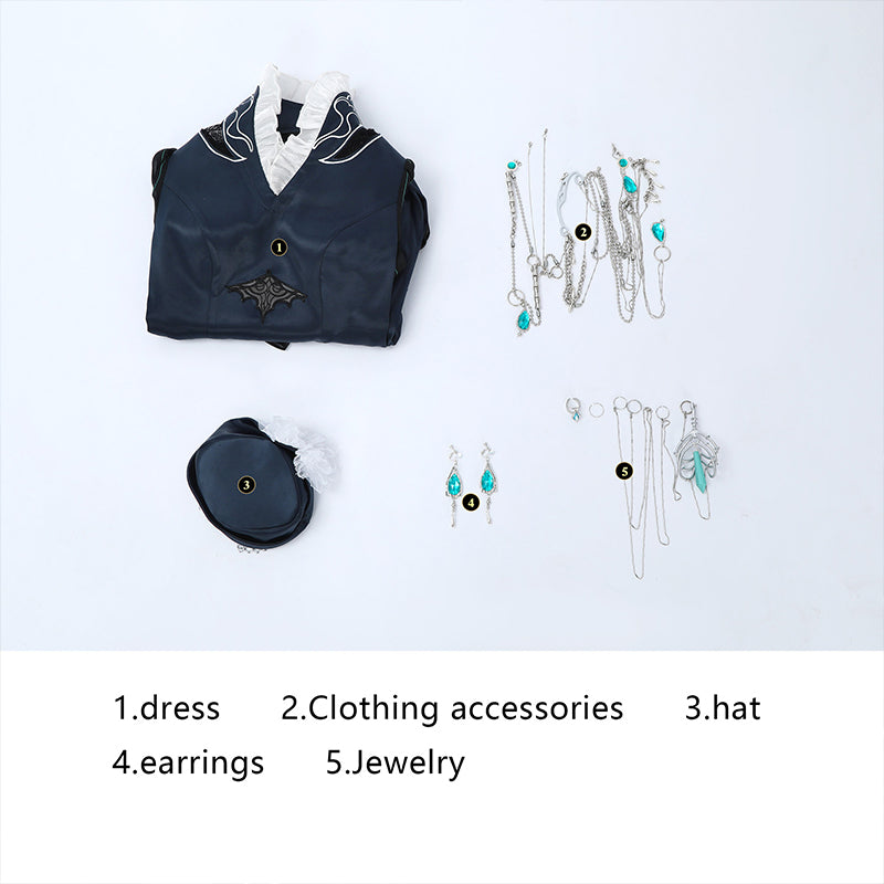 Set Includes: Dress, Clothing accessories, Hat, Earrings, Jewelry